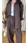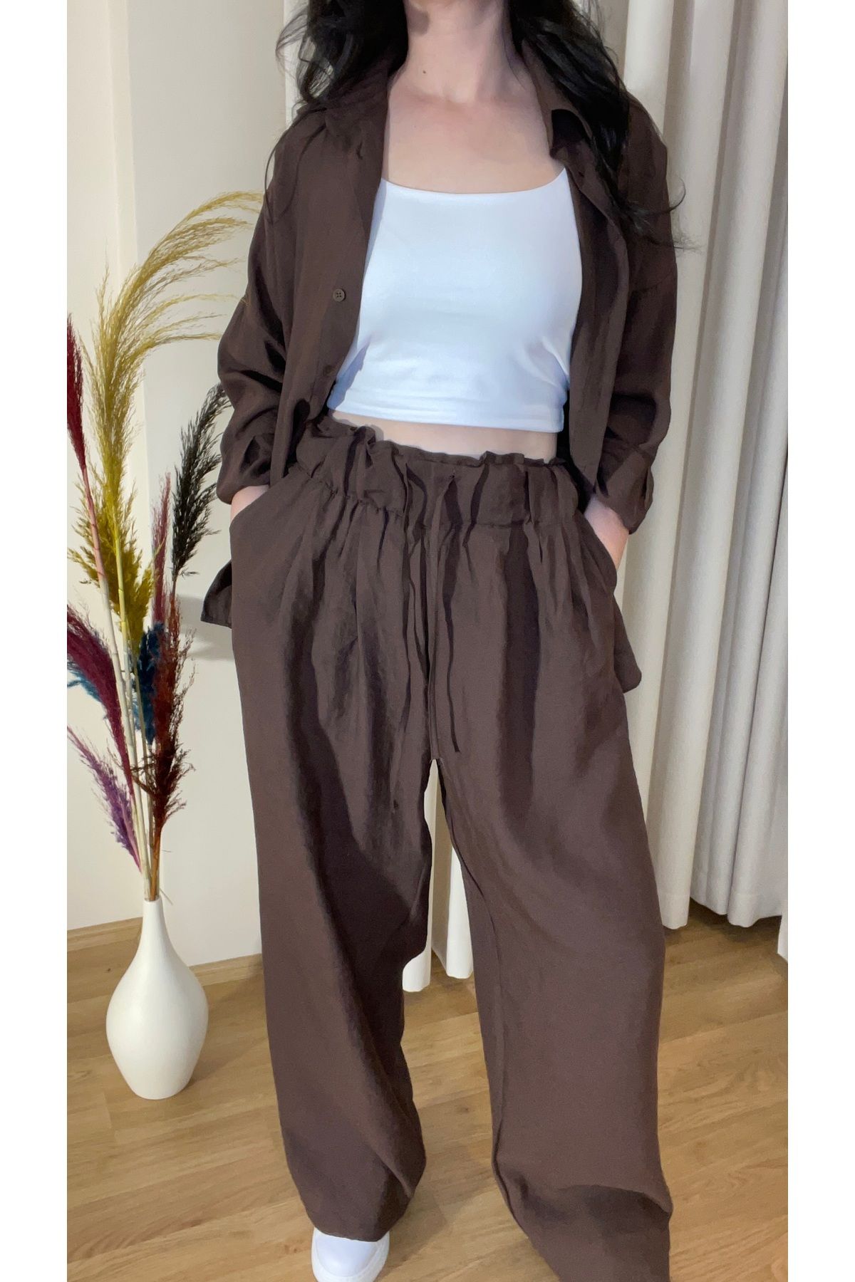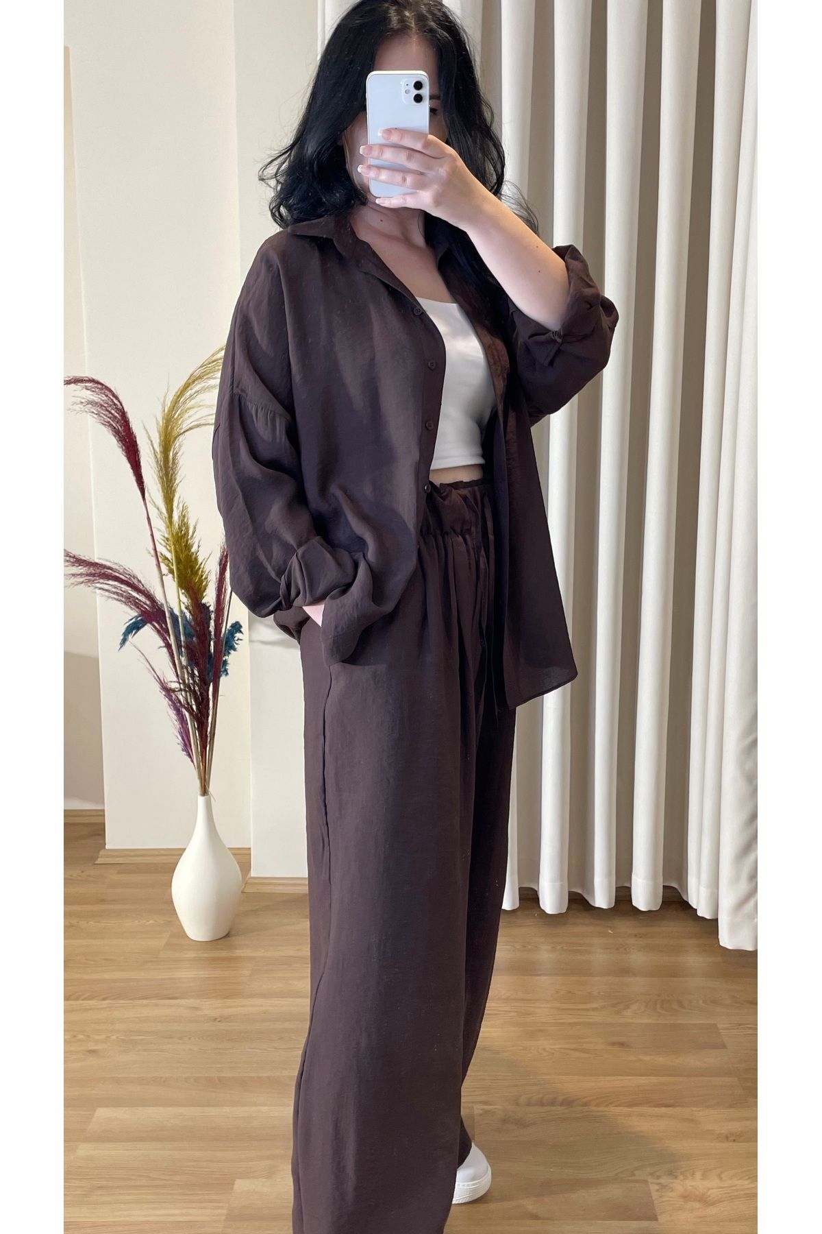 Kadın Oversize Gömlek Pantolon Takım – %100 Pamuk – Acı Kahve