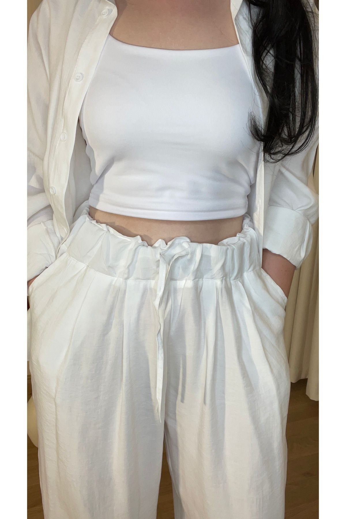 Ürün Özellikleri: • Materyal: %100 Pamuk • Renk: Beyaz • Parçalar: Düğmeli oversize gömlek + beli lastikli bol paça pantolon • Kumaş Türü: Yumuşak, hafif ve dökümlü • Kalıp: Salaş ve rahat kesim • Mevsim: İlkbahar – Yaz – Serin sonbahar akşamları ⸻ Model Üzerindeki Beden: • Boy: 172 cm • Kilo: 65 kg • Giyilen Beden: Medium ⸻ Bakım Talimatı: • 30°C’de makinede yıkanabilir • Ağartıcı kullanılmaz • Düşük ısıda ütülenebilir