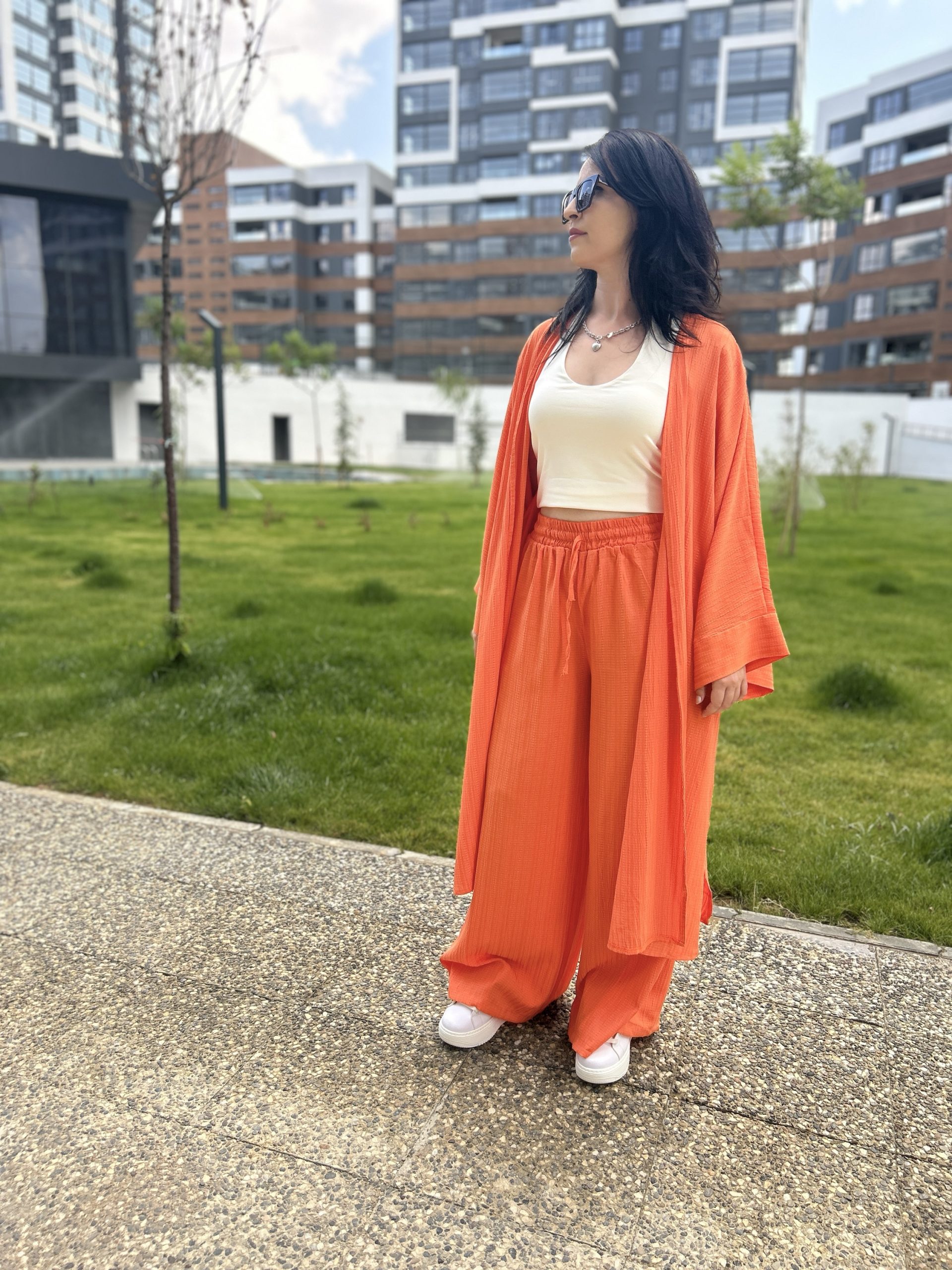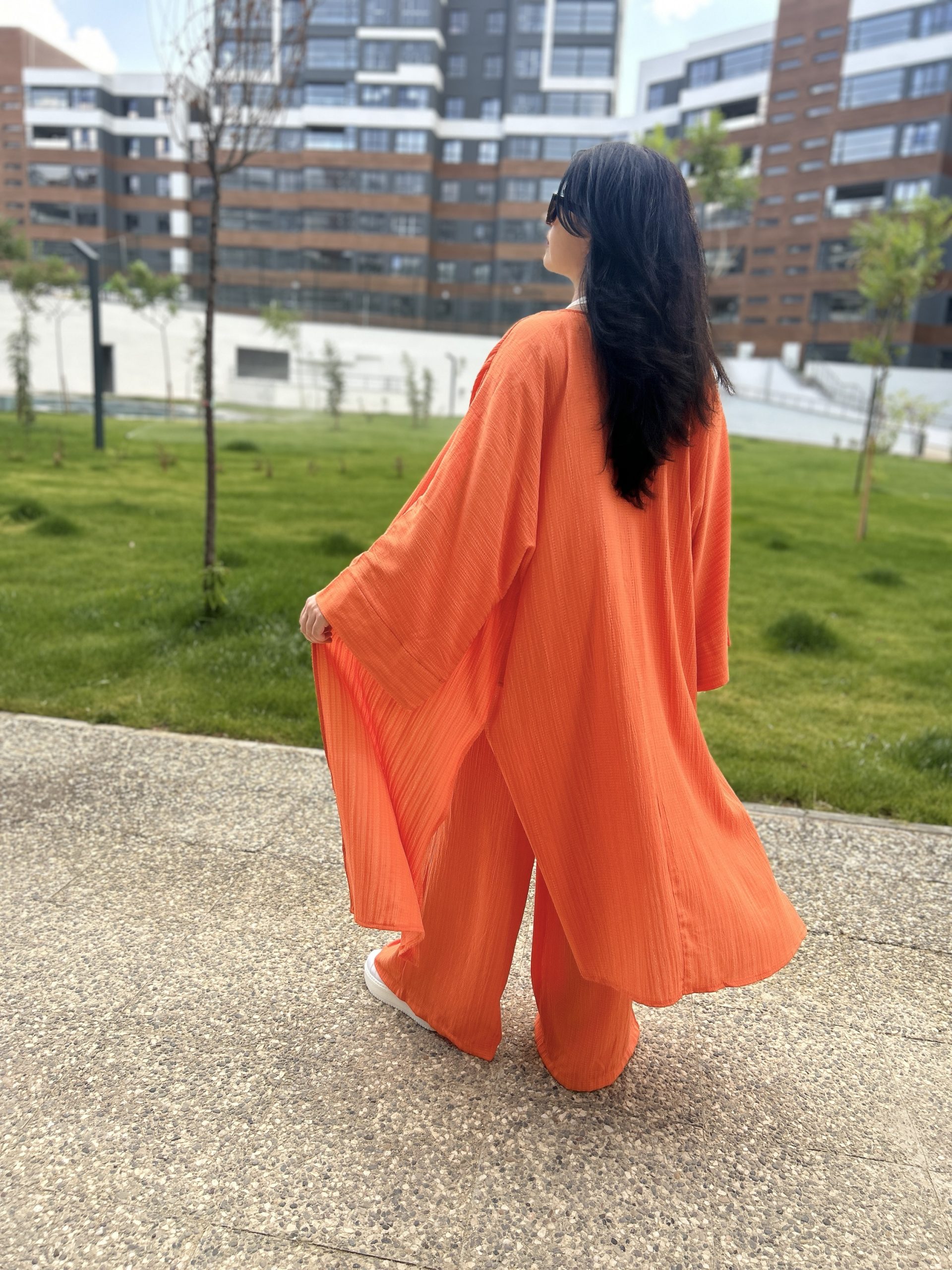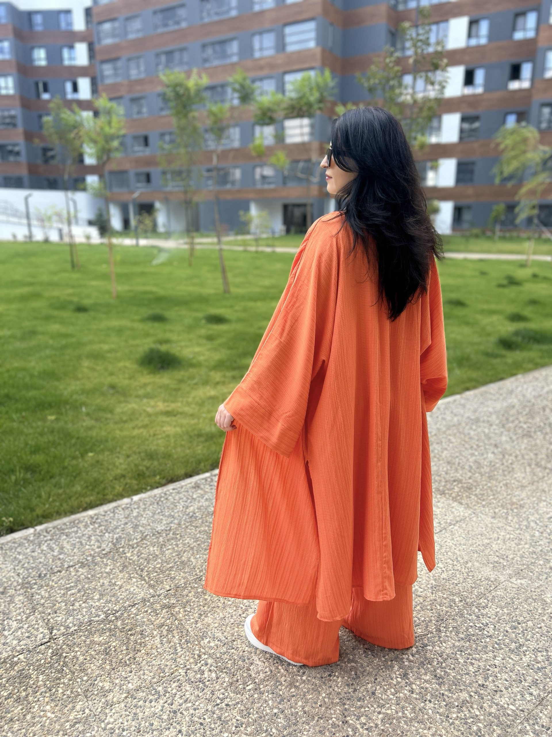 •Beden Uyumu: Oversize kimono, rahat kalıp pantolon