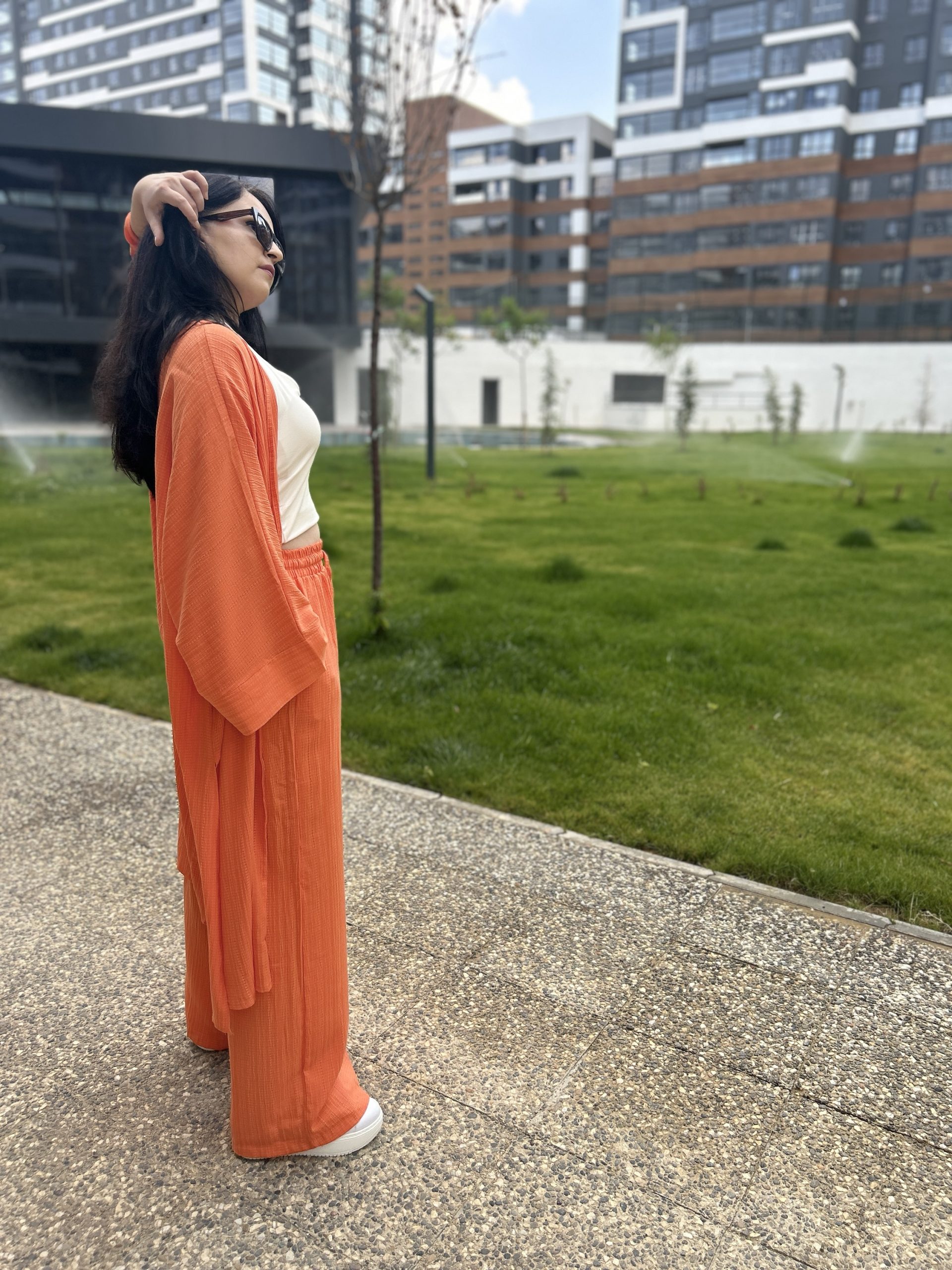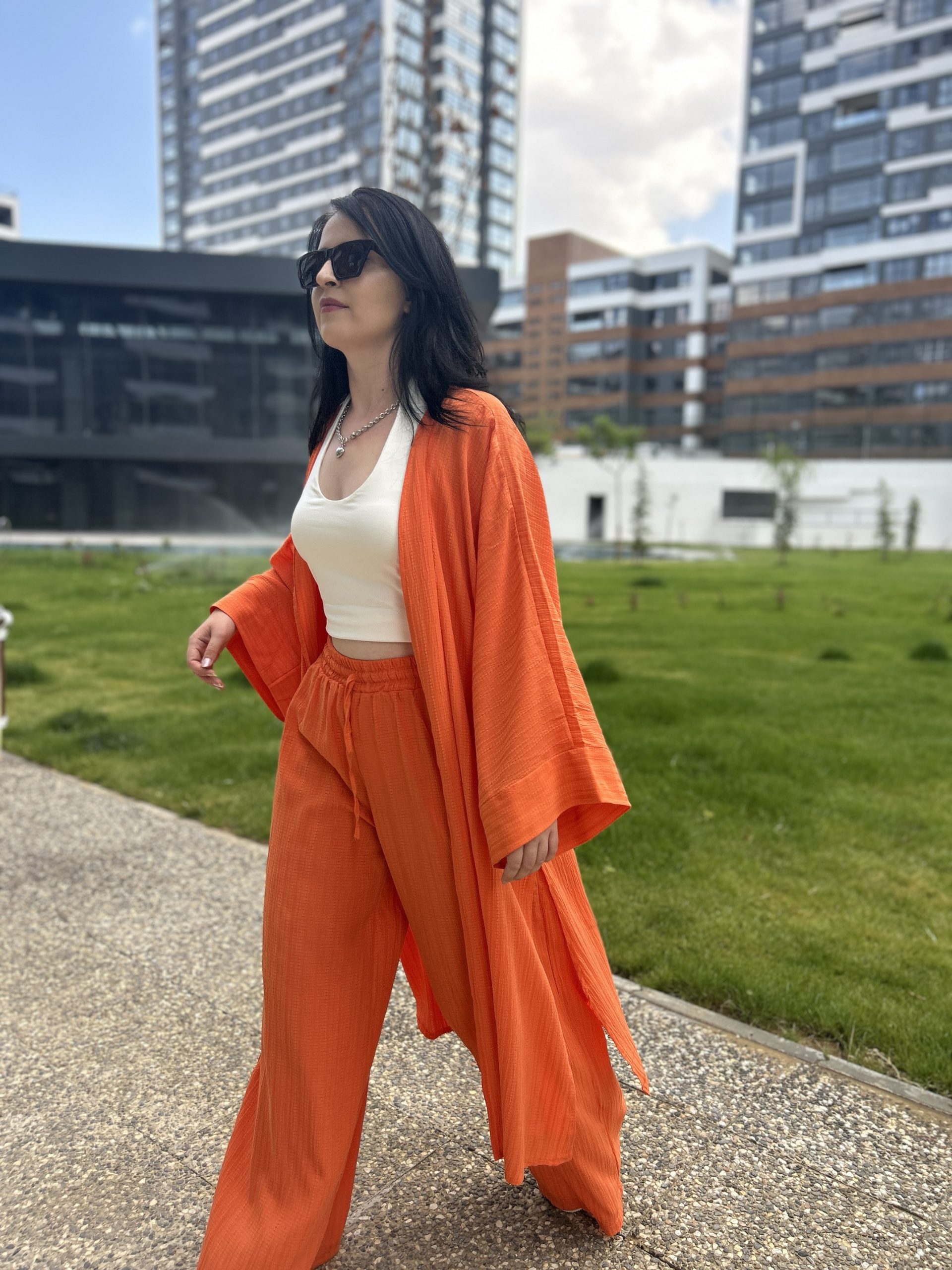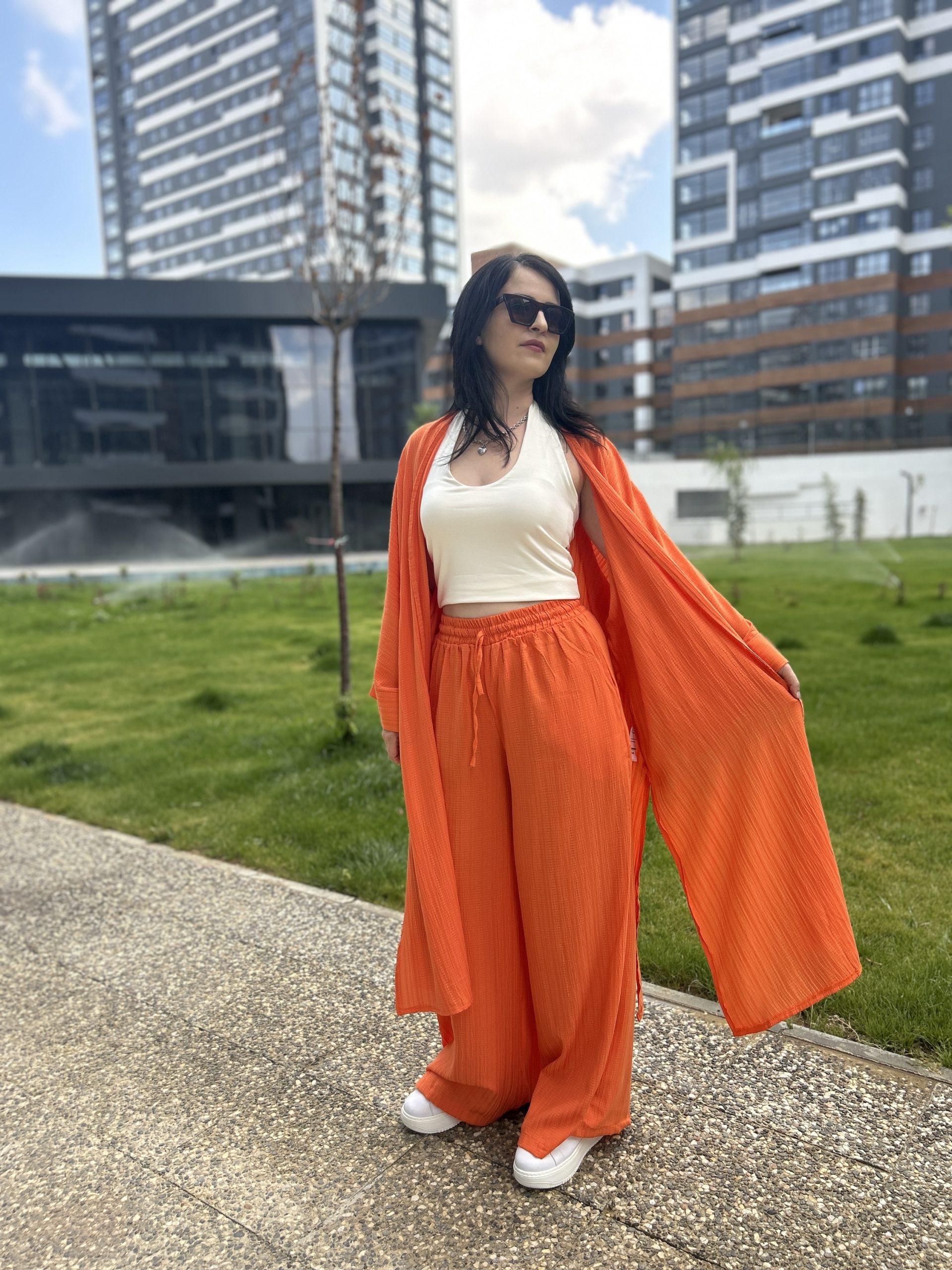 •Beden Uyumu: Oversize kimono, rahat kalıp pantolon