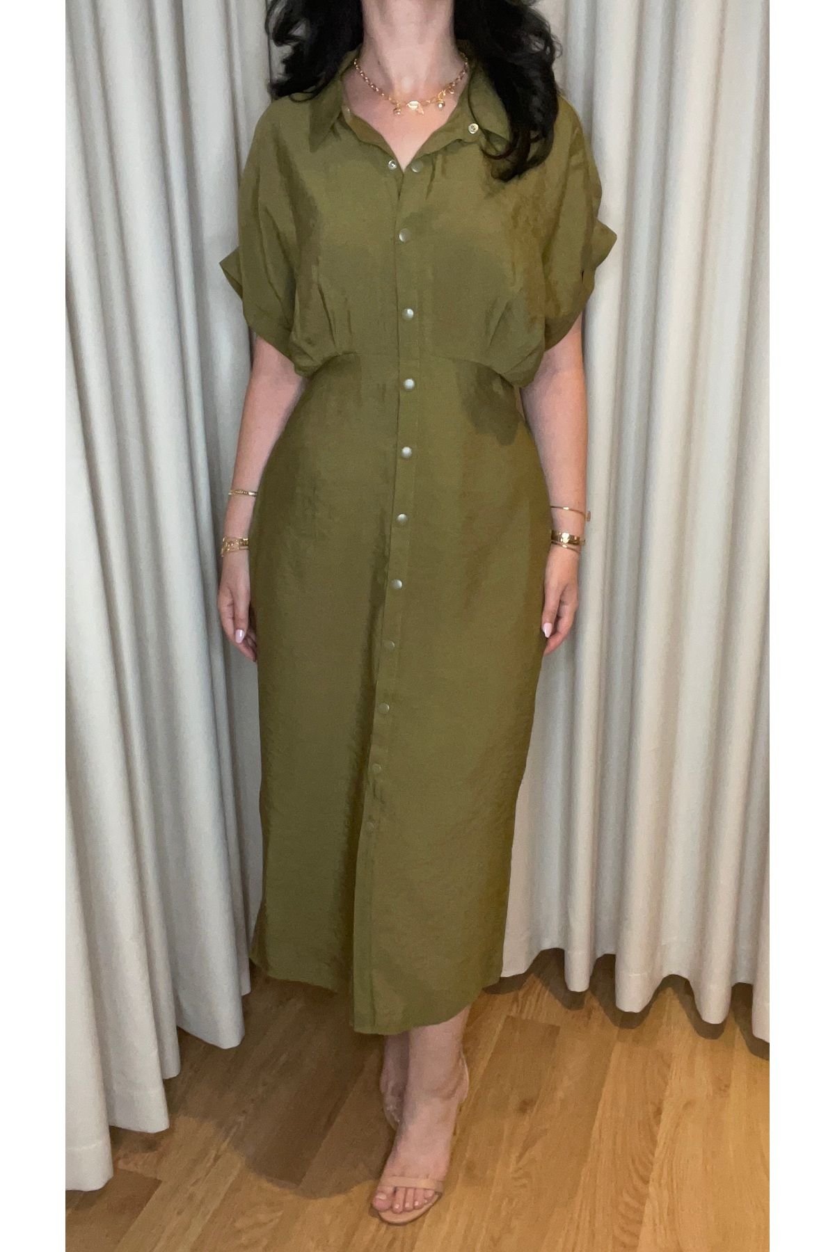 Ürün Özellikleri • Ürün Tipi: Gömlek elbise • Renk: Yağ Yeşili • Boy: Midi Kol Tipi: Kısa kollu Yaka: Klasik yaka Kumaş Türü: Hafif dokulu saten benzeri kumaş • Kalıp: Normal kesim • Detay: Önden düğmeli, belde kuşak • Stil: Şık / Ofis / Günlük • Kapatma: Düğme • Aksesuar: Kuşak dahil • Mevsim: İlkbahar – Sonbahar – Yaz (serin akşamlar) Kullanım Talimatı • Hassas yıkama programında 30°C’de yıkayınız.; • Ağartıcı kullanmayınız.; • Düşük ısıda ütüleyiniz.; • Kuru temizleme yapılabilir.; • Kuşak aksesuarını yıkama öncesi çıkarınız.; • Tersten yıkamanız ve ütülemeniz tavsiye edilir.; Model Ölçüleri Boy : 172 Kilo : 65 Çekimlerde M beden tercih edilmiştir.