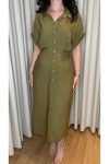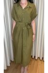 Yağ Yeşili Kısa Kollu Kuşaklı Gömlek Elbise – Midi Boy Şık Ofis ve Günlük Elbise